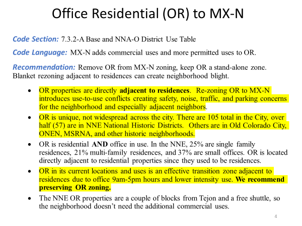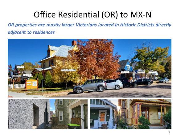 RetoolCOS proposed rezoning Office Residential (OR) properties to Mixed-Use Neighborhood (MX-N). This move would have allowed extensive commercial uses for OR properties. However, our dedicated efforts ensured the preservation of OR zoning, protecting the neighborhood’s original character and intended purpose.