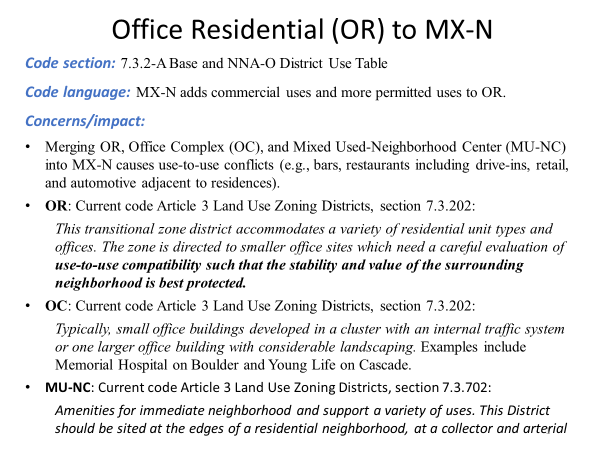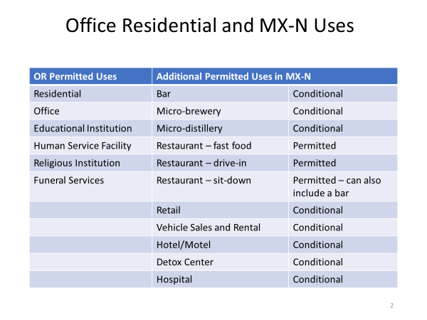 - The proposal was to merge OR into a new mixed-use zoning district MX-N (currently only has OC)